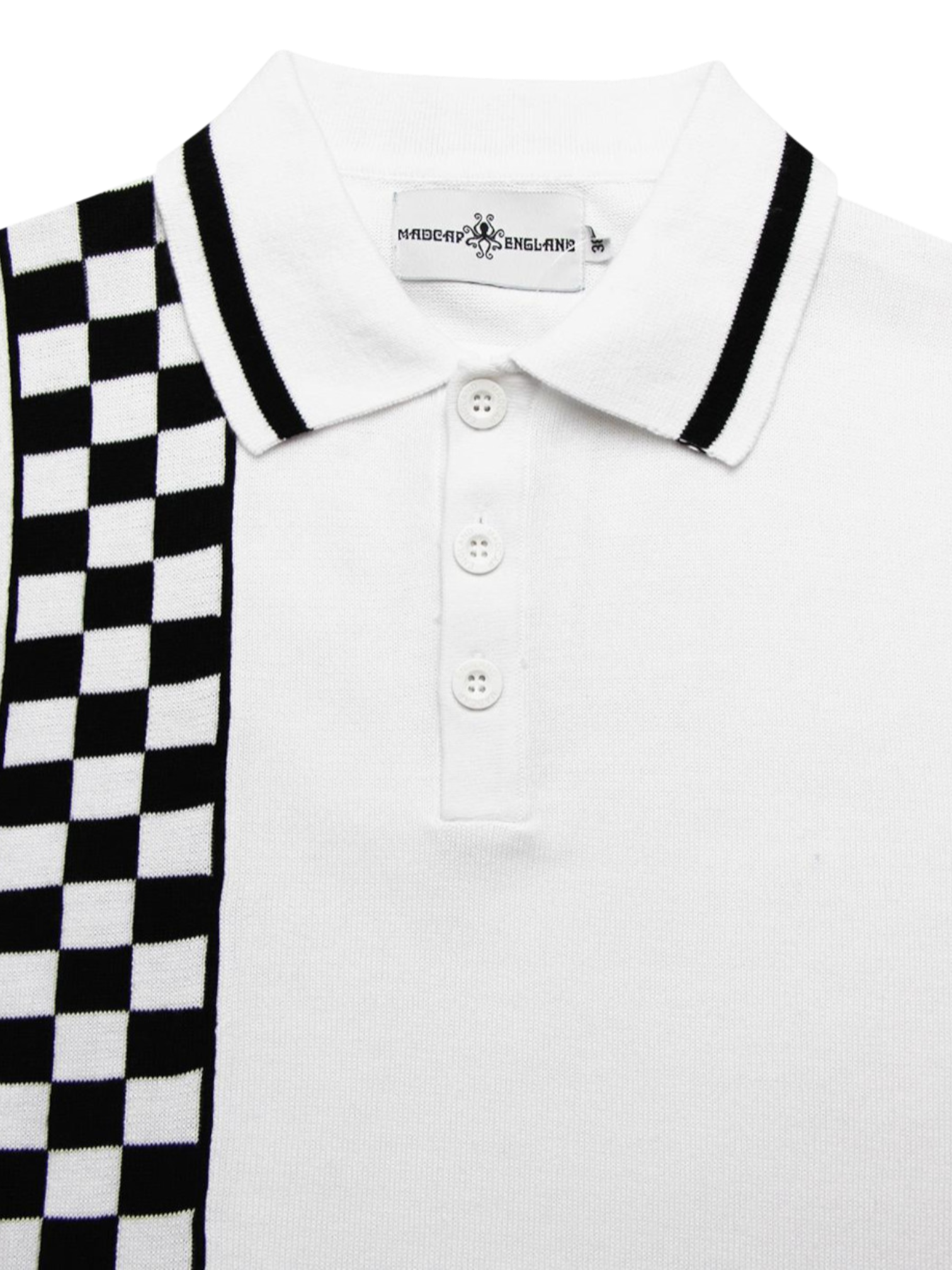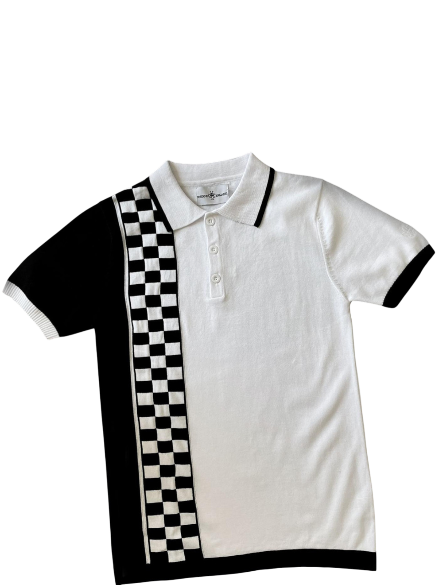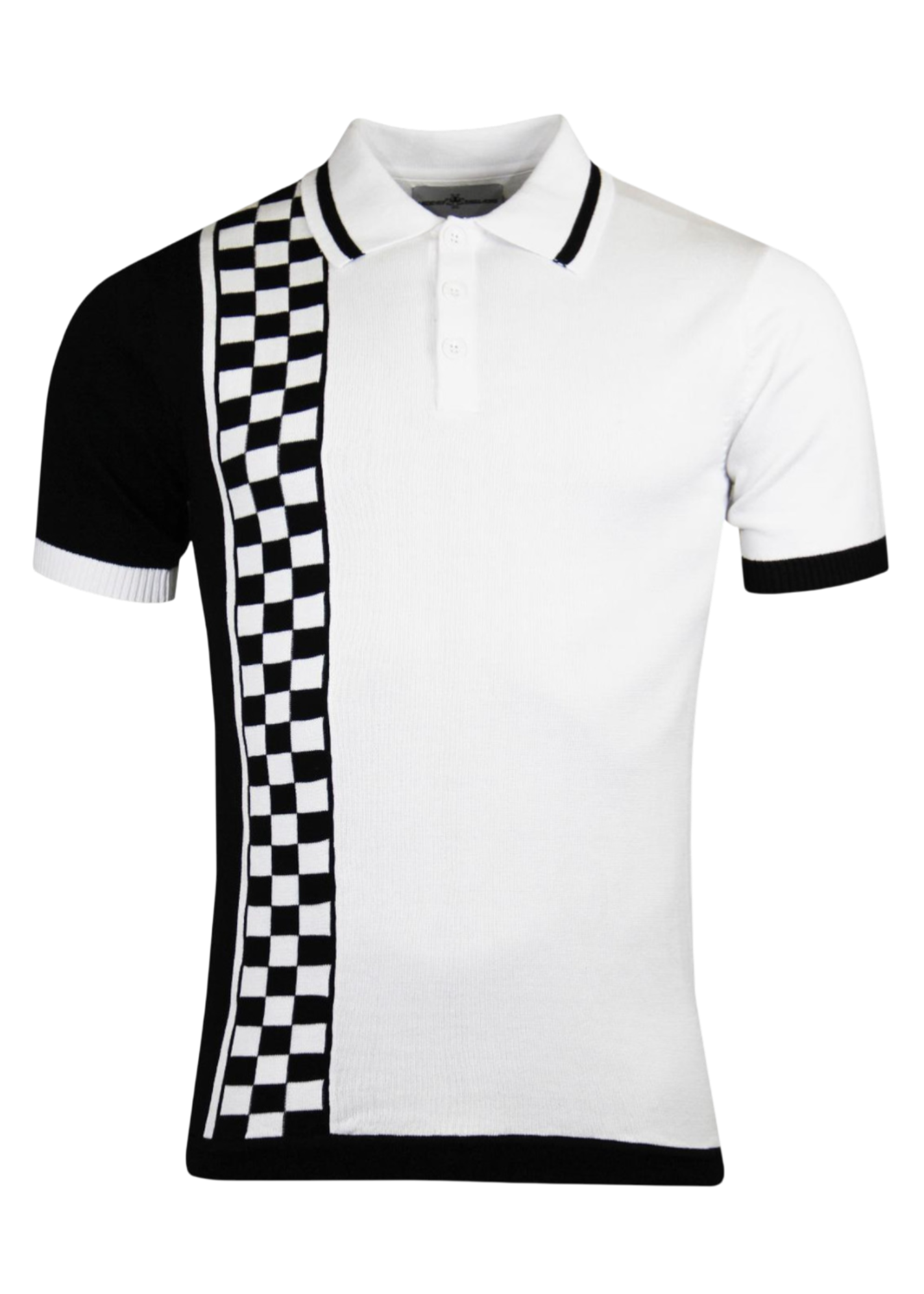 Retro mod / ska knitted polo met checkerboard “racing stripe” aan één zijde