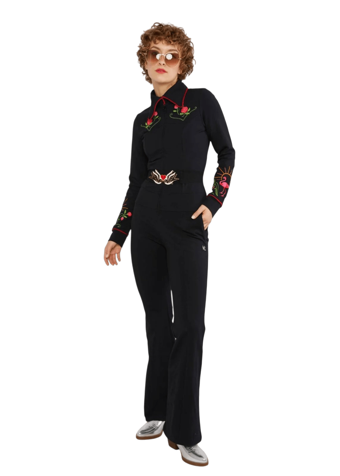 De outfit heeft een omslagkraag met contrasterende kanten rand en sluit met een ritssluiting aan de voorkant. Praktische steekzakken op heuphoogte maken het ontwerp compleet. De multicolour borduursels geven het geheel een unieke retro uitstraling, terwijl de uitlopende pijpen zorgen voor een speelse finishing touch.