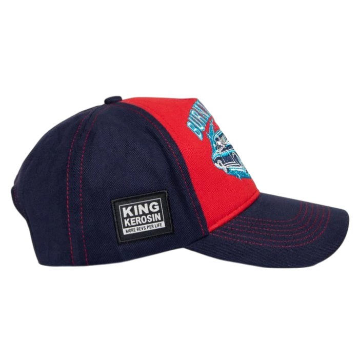 Breng klassieke stijl en een flinke dosis oldtimer-passie in je dagelijkse look met de King Kerosin “Burnin’ Fire” baseball cap. Deze cap combineert stevige materialen met een tijdloos design – perfect voor liefhebbers van klassieke auto’s. De cap is uitgevoerd in donkerblauw aan de voor- en achterkant, met rode accenten zoals contrasterende stiksels en een rode frontpanel die direct in het oog springt.