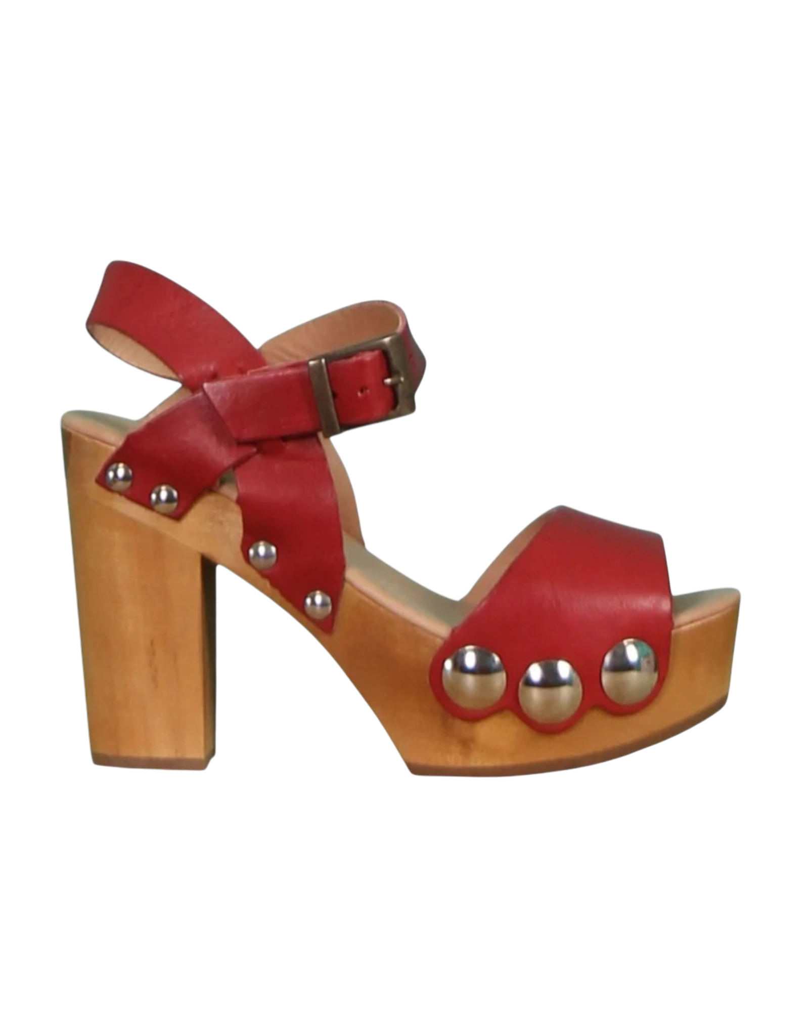 De sandaal heeft een leren binnenzool en een rubberen buitenzool met profiel voor extra grip. De klinknagels langs de zijkanten geven de schoen een stoere uitstraling, terwijl de verstelbare gesp bij de enkel zorgt voor een goede pasvorm.