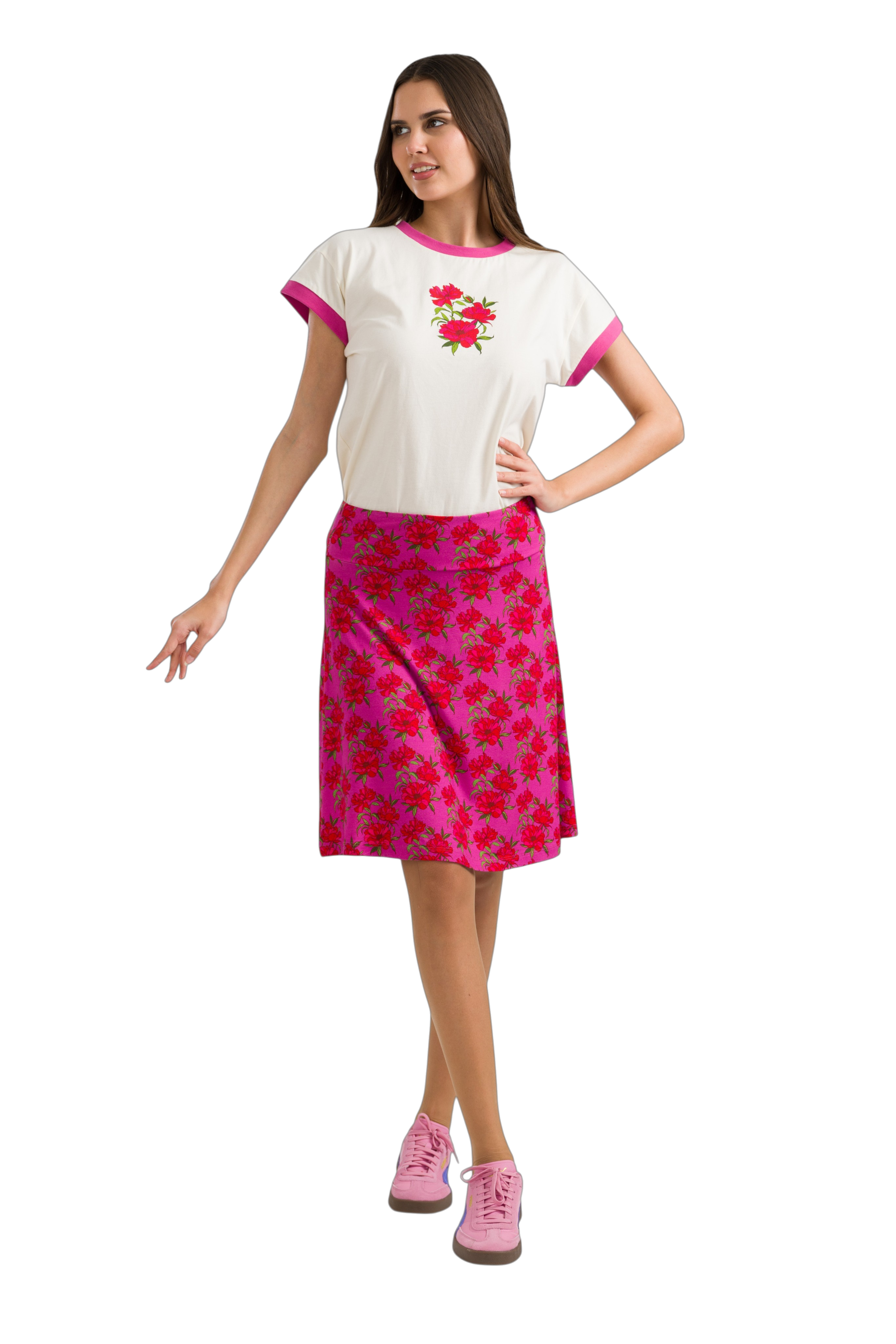 De Esmee Skirt heeft een elegante high-waist tailleband en een flatterende A-lijn pasvorm. De rok is gemaakt van zachte ECOVERO™ viscose en uitgevoerd in de levendige Fuchsia Flowers print, die de frisse kleuren van de natuur naar je garderobe brengt.