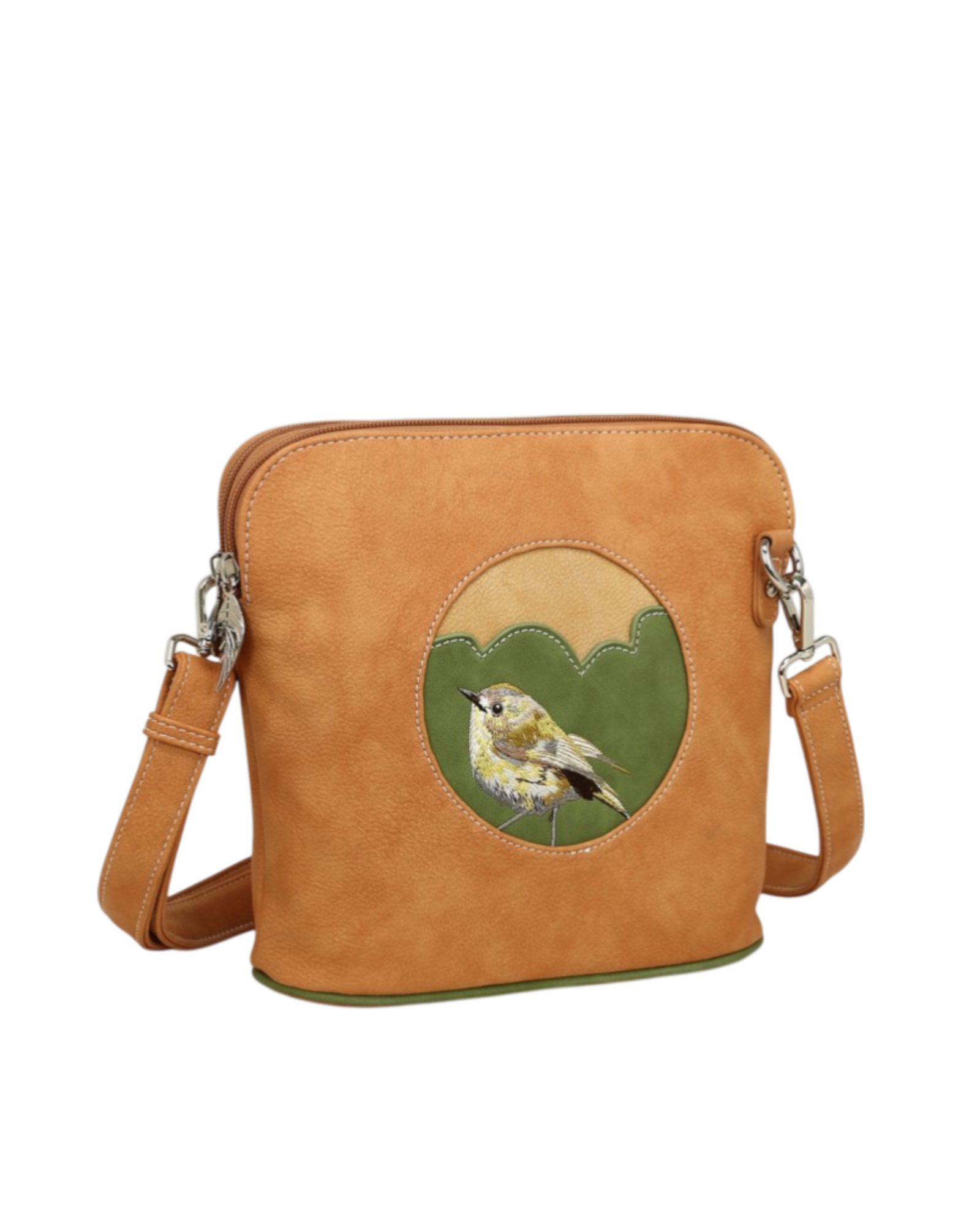 Deze bijzondere tas is vernoemd naar het charmante goudvinkje op de voorkant. Het geborduurde vogeltje wandelt over een speels patchworklandschap, waardoor de tas zelf aanvoelt als een klein kunstwerk.
