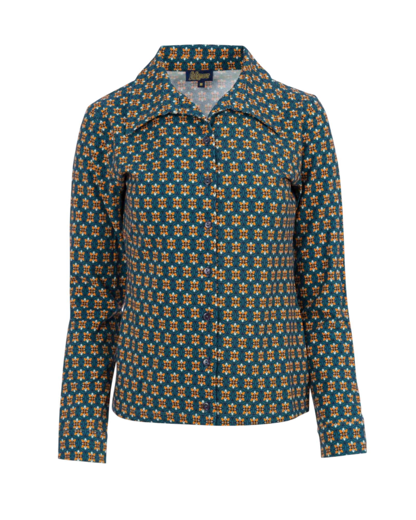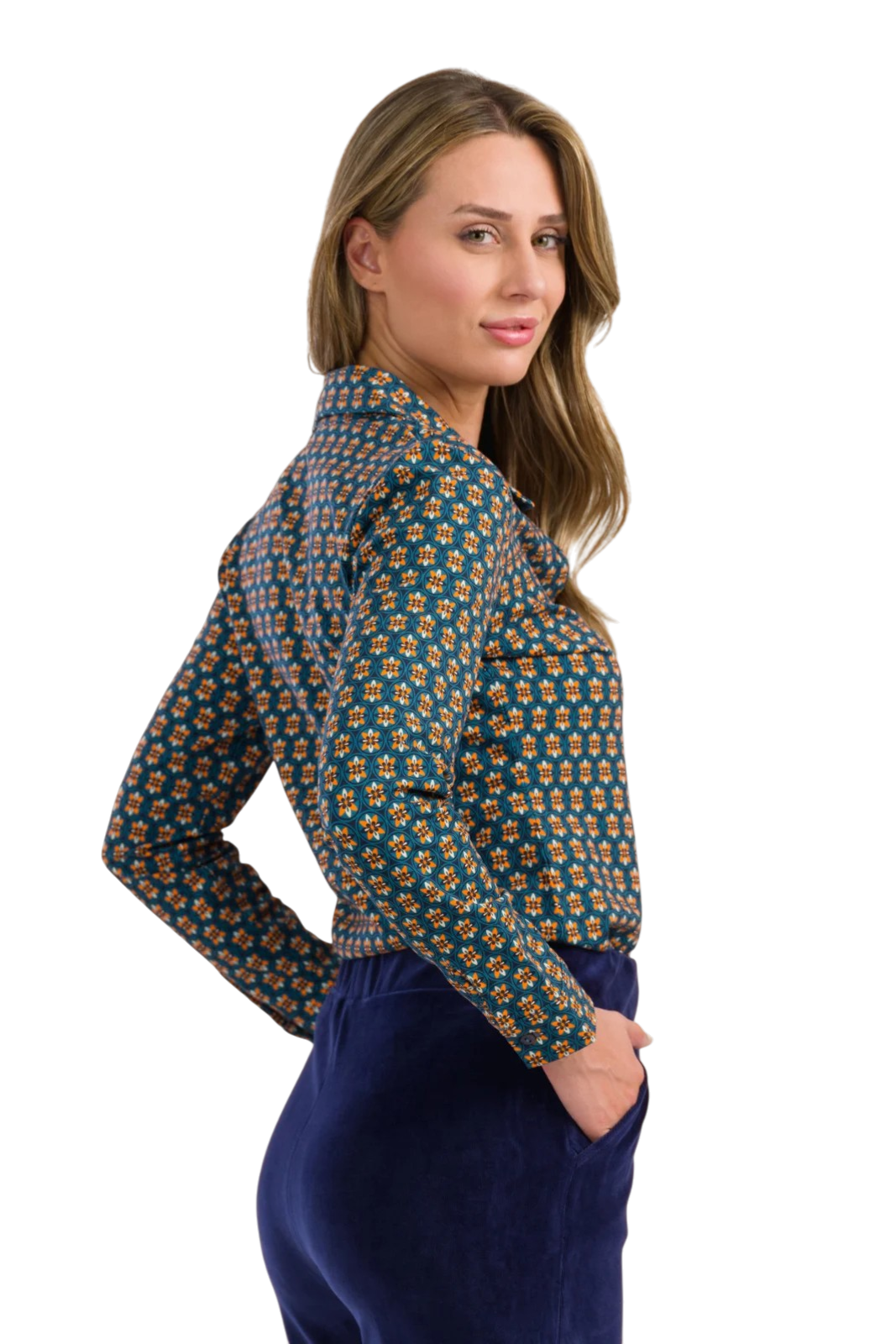 De blouse is gemaakt van 95% biologisch katoen (GOTS™) met een beetje elastaan, waardoor de stof zacht, ademend en licht rekbaar is. Het gedrukte ontwerp geeft de blouse een speelse en stijlvolle uitstraling.