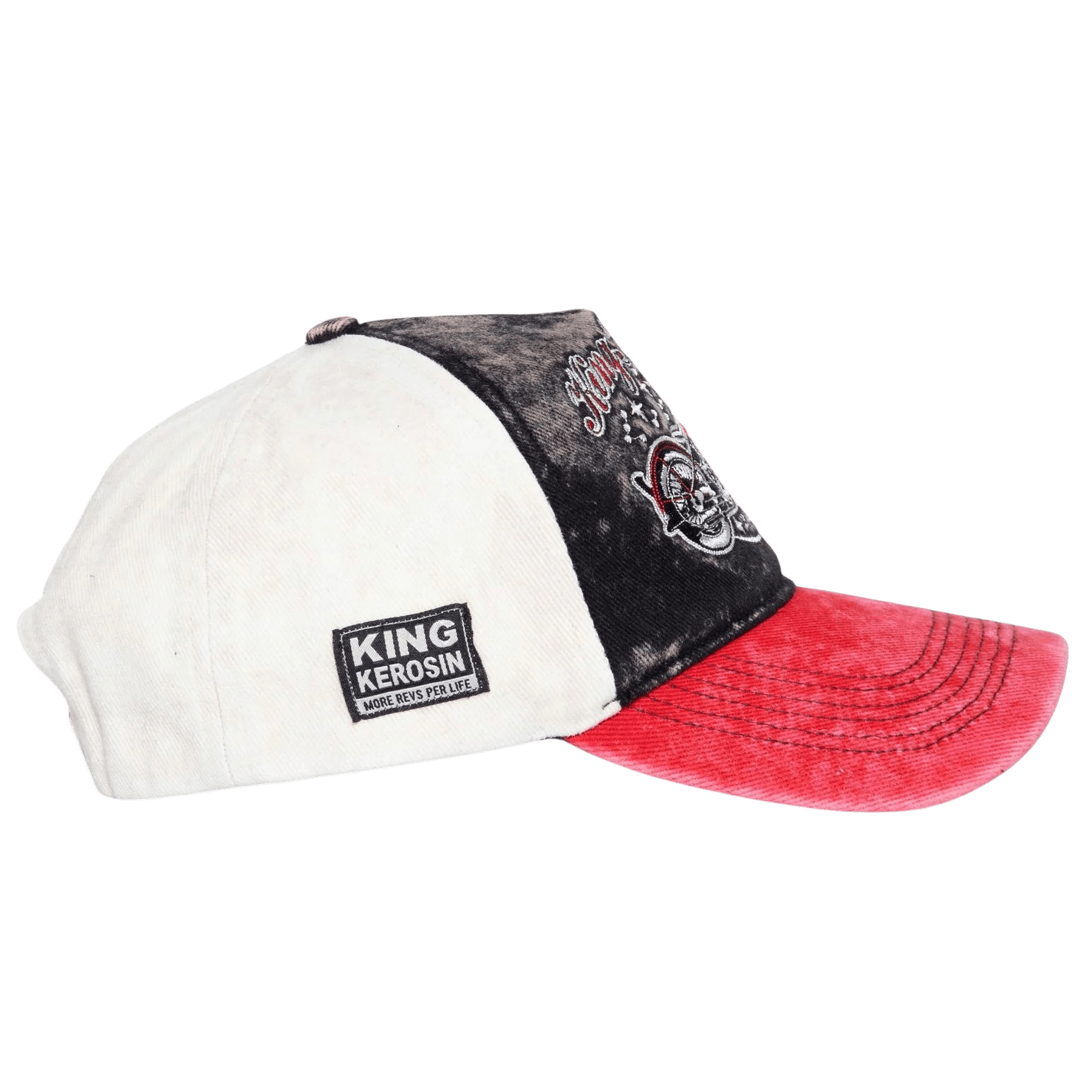 Het contrastrijke 3-kleuren design met een rode klep en een off-white achterkant geeft de cap extra karakter. De acid-wash/used look zorgt voor een authentiek vintage effect, alsof je ‘m al jaren draagt. Afgewerkt met een subtiele King Kerosin patch aan de zijkant en een verstelbare 7-gaats sluiting voor een perfecte pasvorm. Een absolute must-have voor fans van de 50’s motorcultuur en iedereen die een statement wil maken.