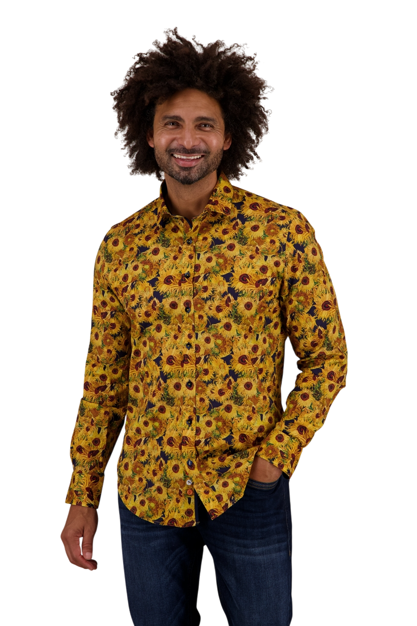 Het Sunflowers F Classics overhemd is een echte Fred-klassieker: een uitgesproken zonnebloemenprint