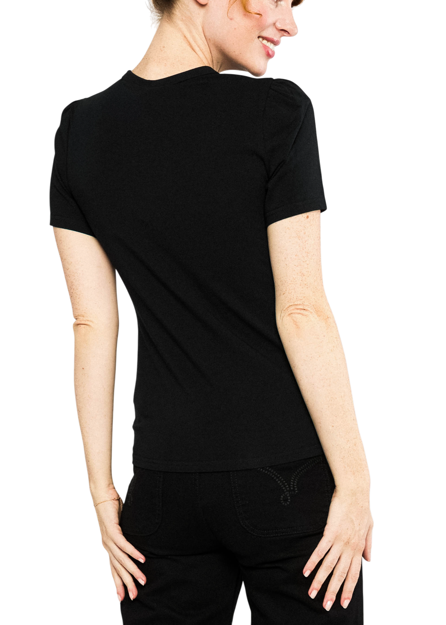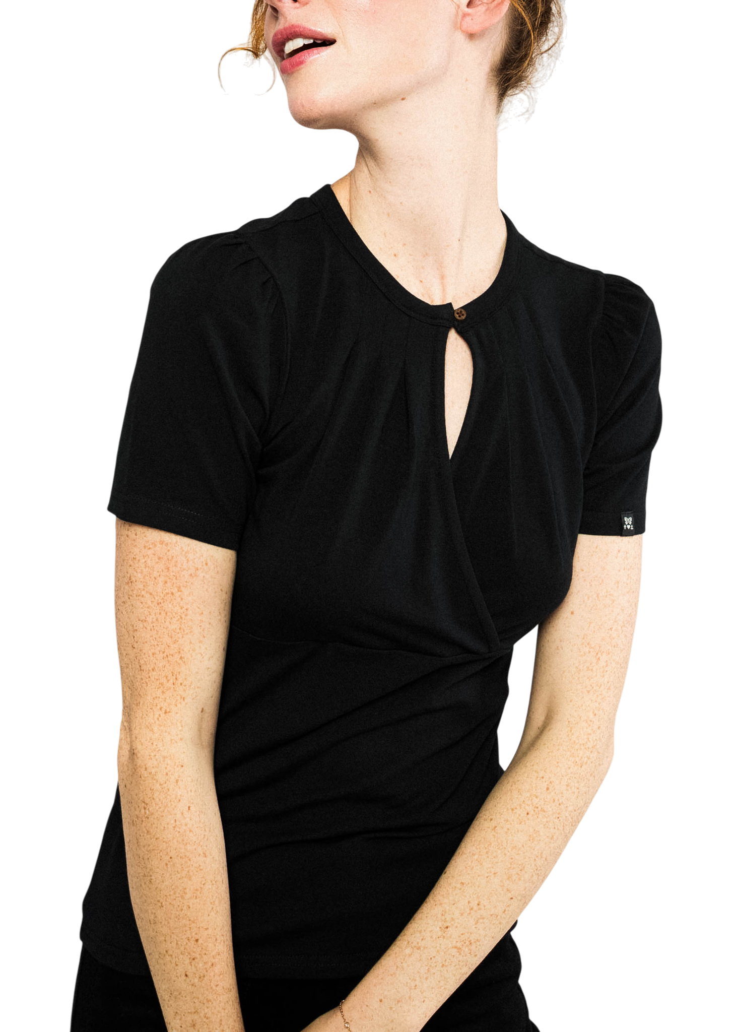 Aansluitend T-shirt met een speelse hartjesprint en een vrouwelijke criss-cross halslijn. De zachte biologische katoenjersey met stretch voelt comfortabel aan en volgt mooi de lichaamsvorm.