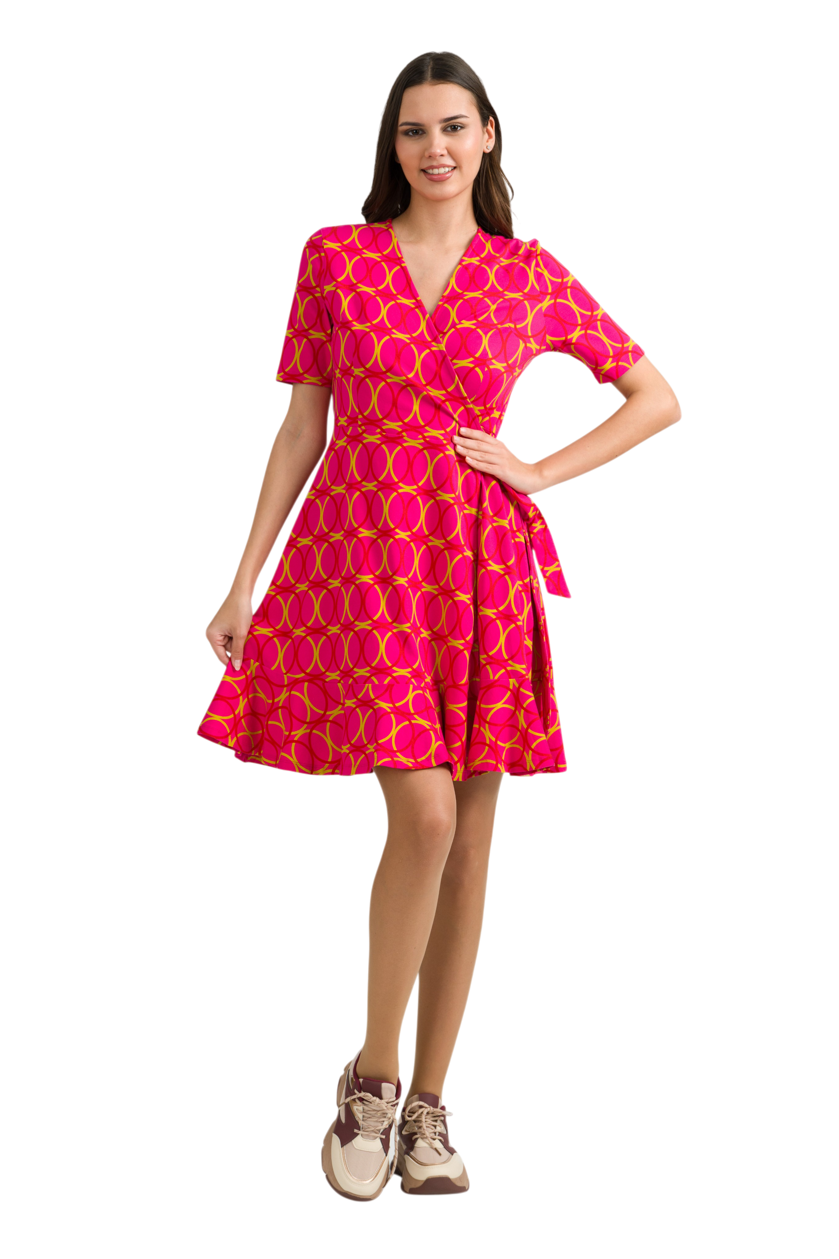 De Julia Wrap Dress is gemaakt van rekbare biologisch katoenen jersey en uitgevoerd in de kleurrijke Bubble Beat geometrische print. De jurk heeft een elegante double-breasted V-hals die zorgt voor een vrouwelijke en flatterende pasvorm.