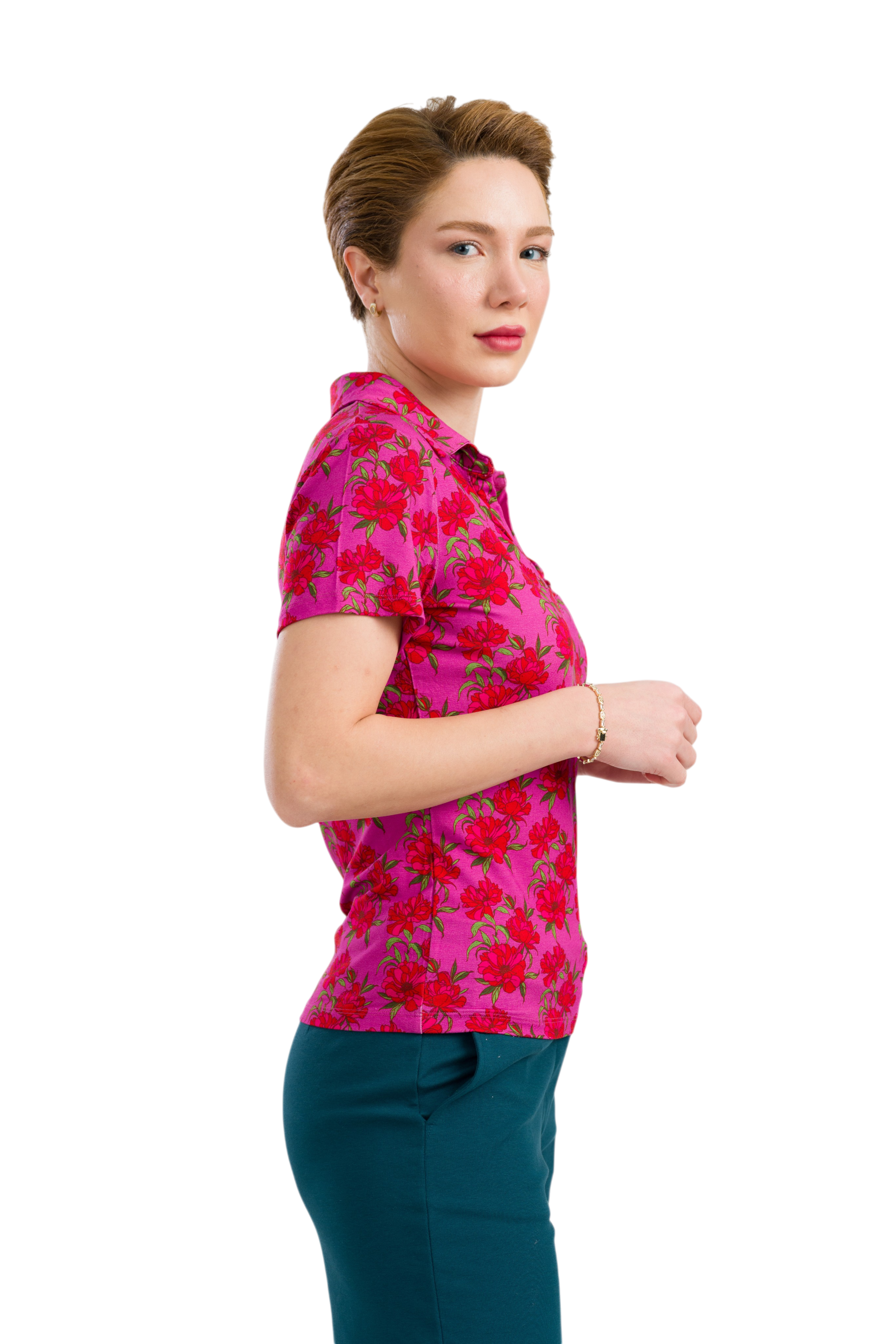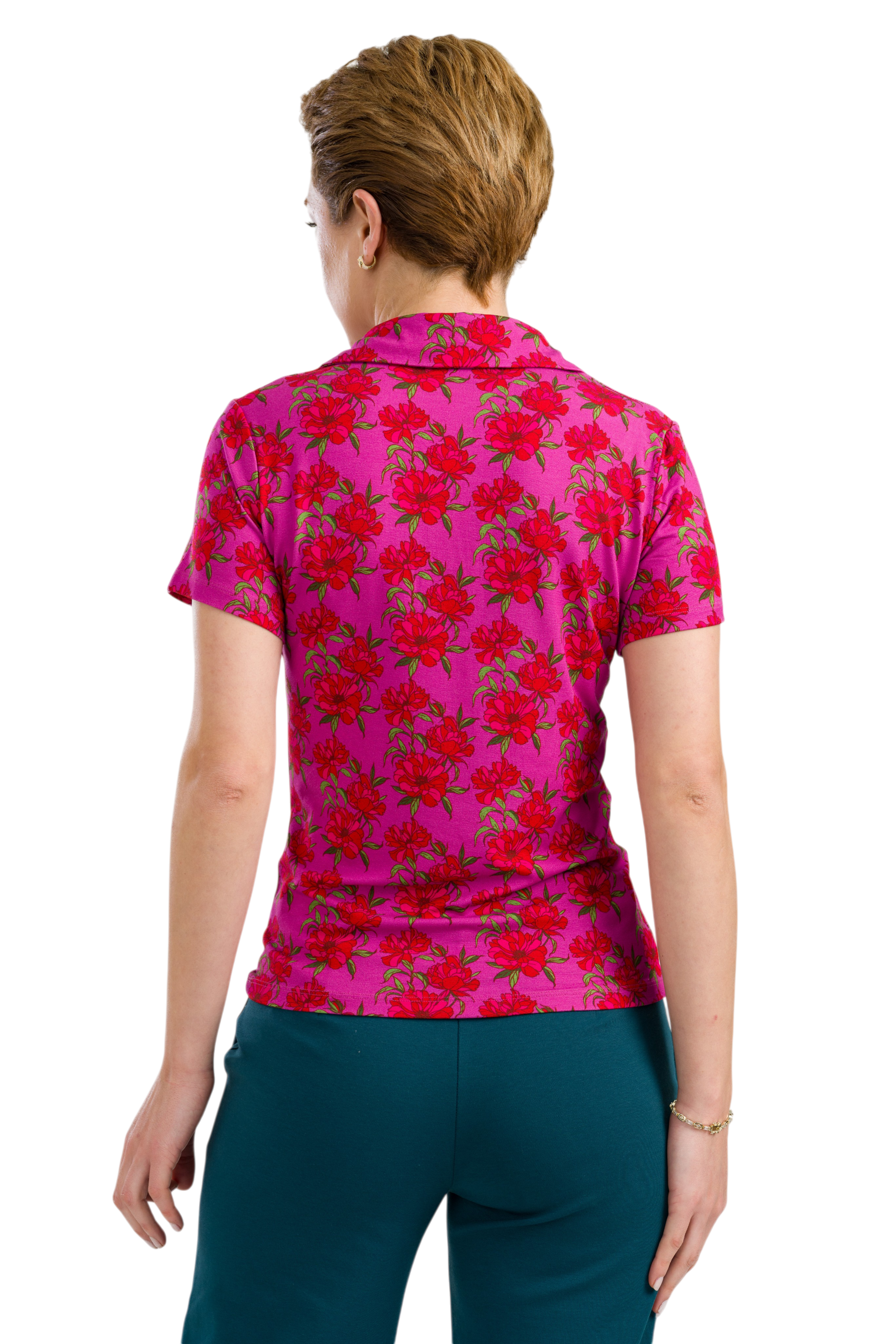 De Suzy Top heeft een elegante uitstraling dankzij de plooien op de borst en de mooi gevormde platte kraag. Deze uitvoering is uitgevoerd in de levendige Fuchsia Flowers print en gemaakt van zachte ECOVERO™ viscose jersey, wat zorgt voor een comfortabele en soepele pasvorm.