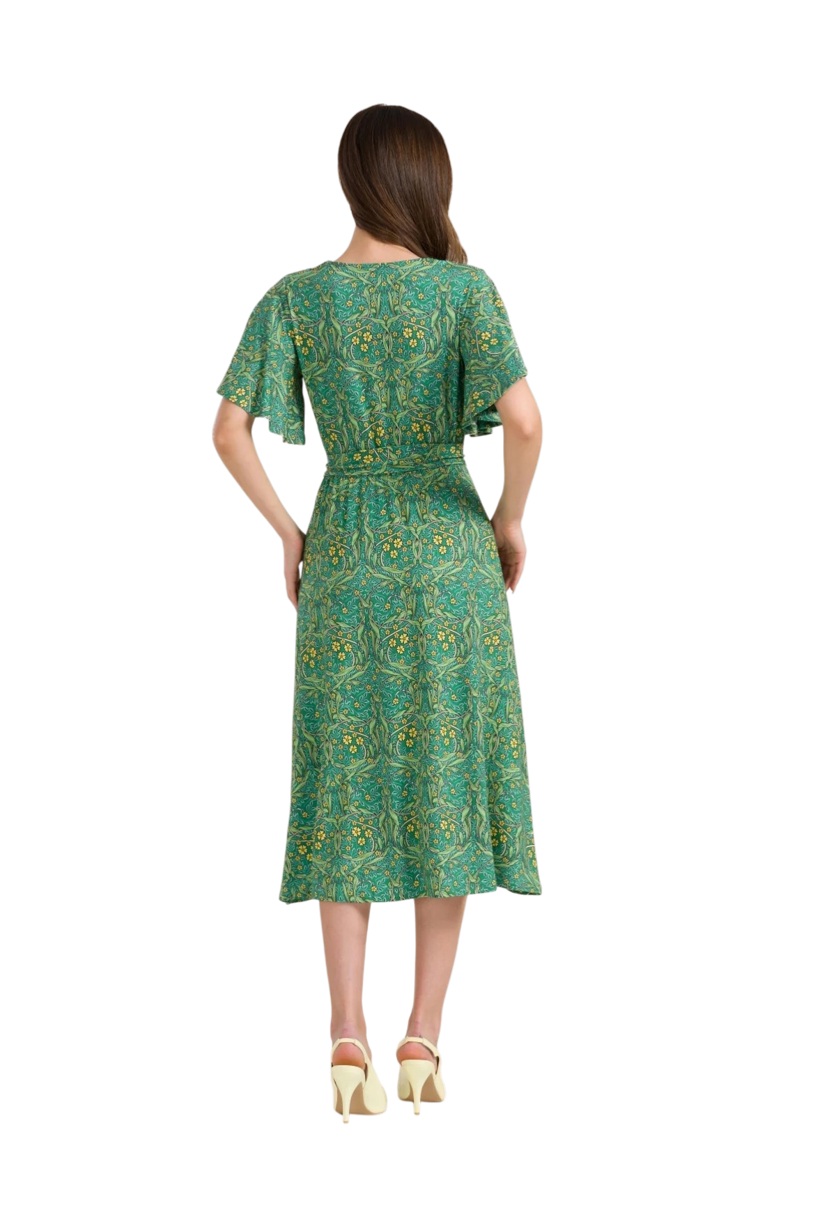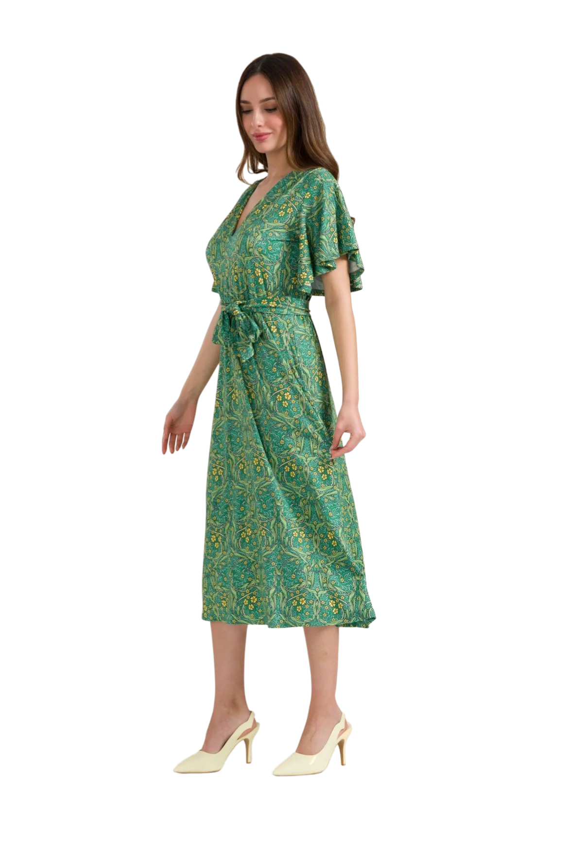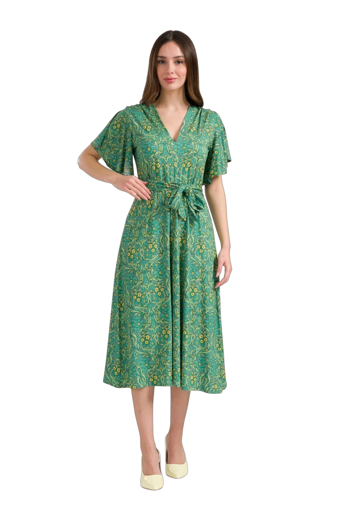 De Trix-jurk in de kleur Curly Wurly Green heeft een zachte, soepelvallende stof en een elegante, vrouwelijke uitstraling. De flatterende V-hals en elastische taille zorgen voor een comfortabele pasvorm die het silhouet mooi accentueert. De verfijnde groene print met bloemenaccenten geeft de jurk een tijdloze en stijlvolle look.