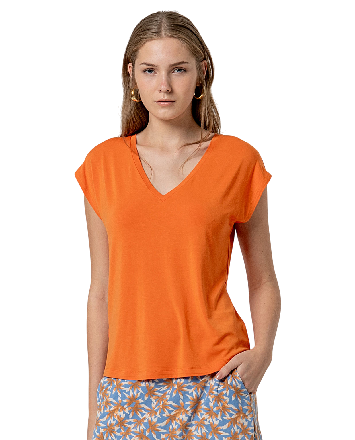 De V-Neck T-Shirt van Surkana in Orange is een frisse basic met een vrouwelijke, zomerse uitstraling. De V-hals zorgt voor een mooi open silhouet, terwijl de zachte stof heerlijk comfortabel draagt.