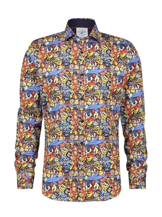 met een kunstzinnige, bijna stripachtige all-over print. Dit shirt barst van kleur,