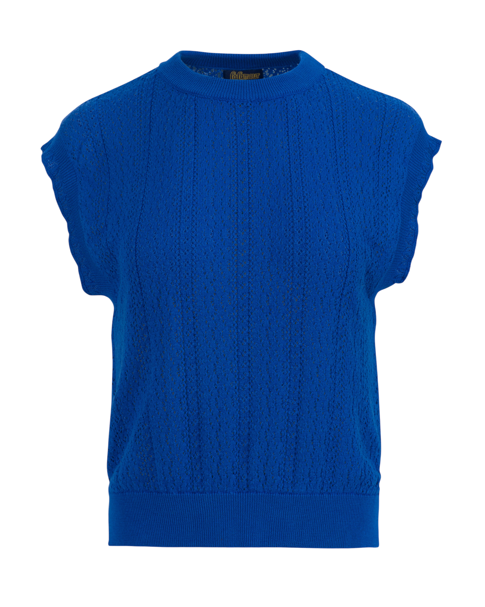 De Knitwear Pippa Top is uitgevoerd in een stijlvolle effen blauwe kleur en gemaakt van 100% biologisch katoen. Het gebreide ontwerp heeft een bijzondere jacquard structuur die de top een verfijnde uitstraling geeft.