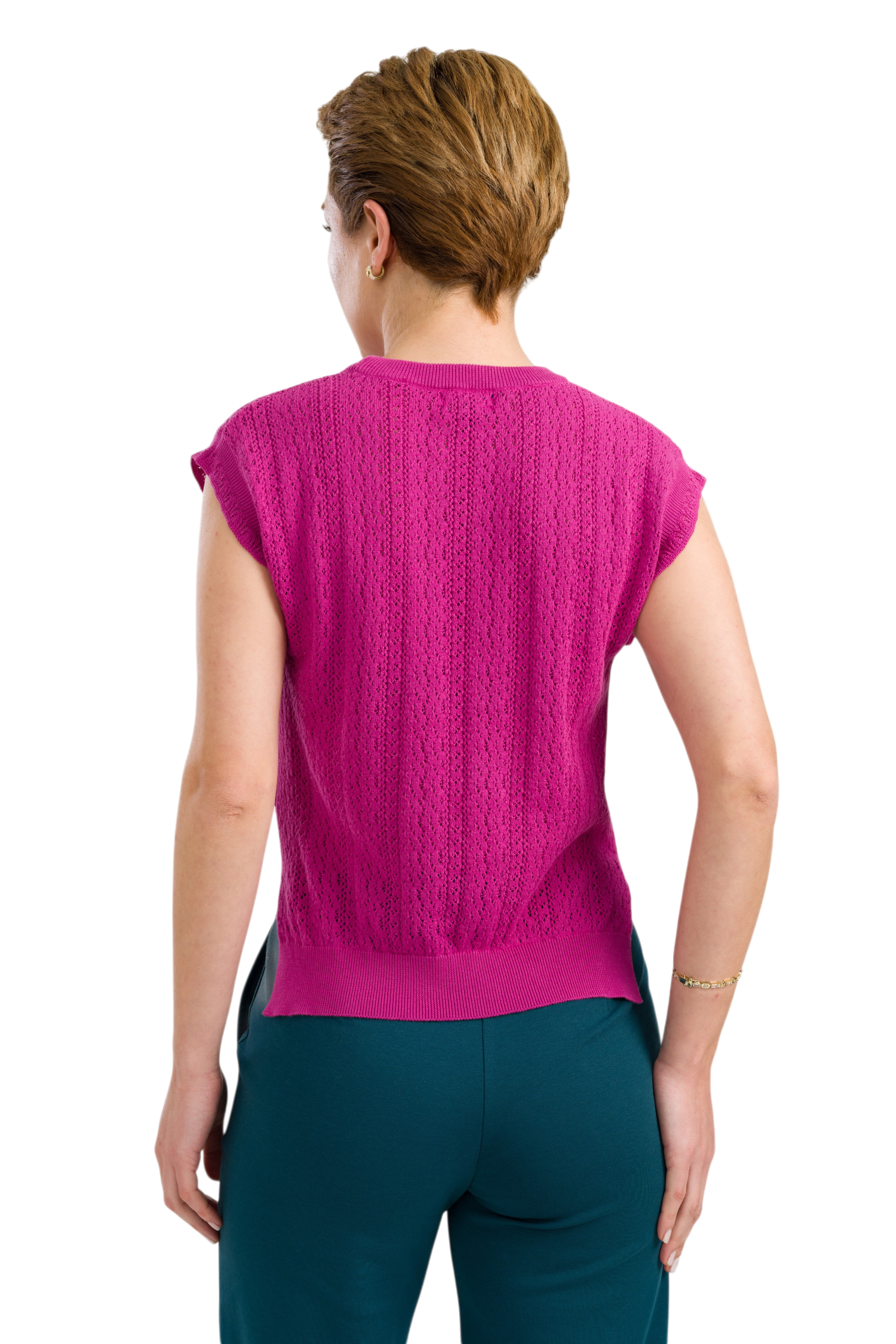 De Knitwear Pippa Top is uitgevoerd in een opvallende effen fuchsia kleur en gemaakt van 100% biologisch katoen. Het gebreide ontwerp heeft een subtiele jacquard structuur die de top een verfijnde en stijlvolle uitstraling geeft.