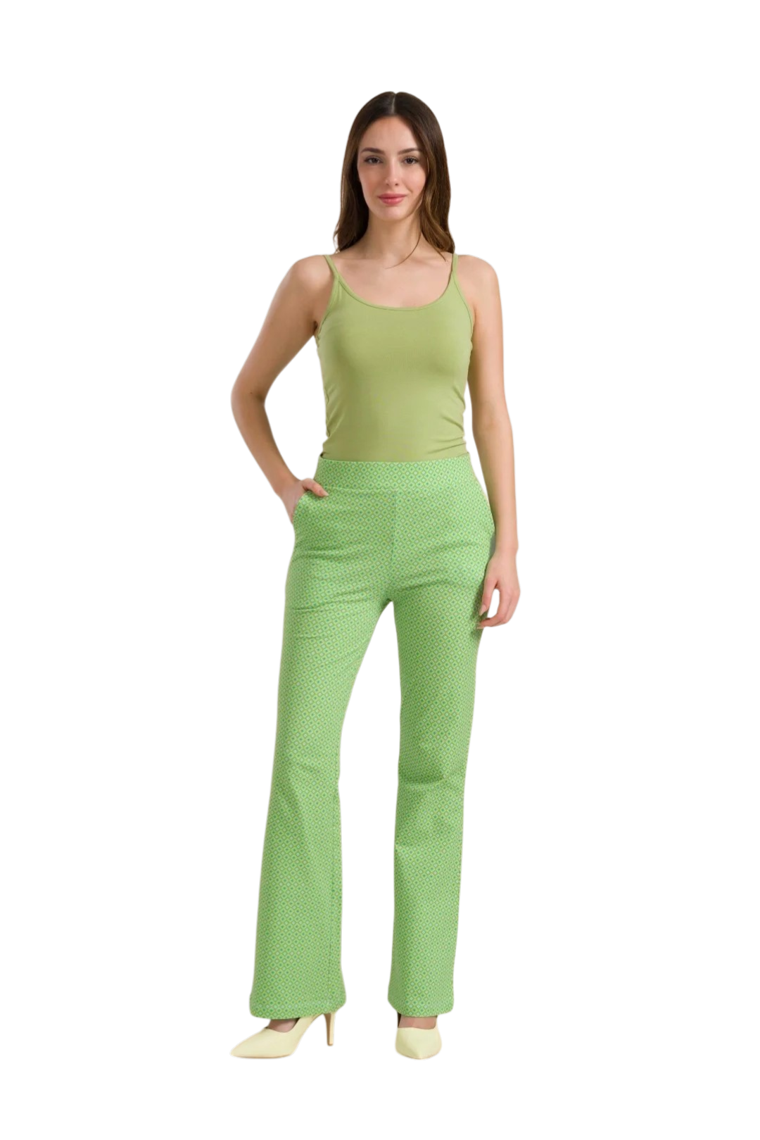 Comfortabele broek met een uitlopende, licht flarende pijp en een opvallende Mozaiek print. De zachte biologische katoenkwaliteit met stretch draagt prettig en de elastische boord zorgt voor een fijne, makkelijke fit.