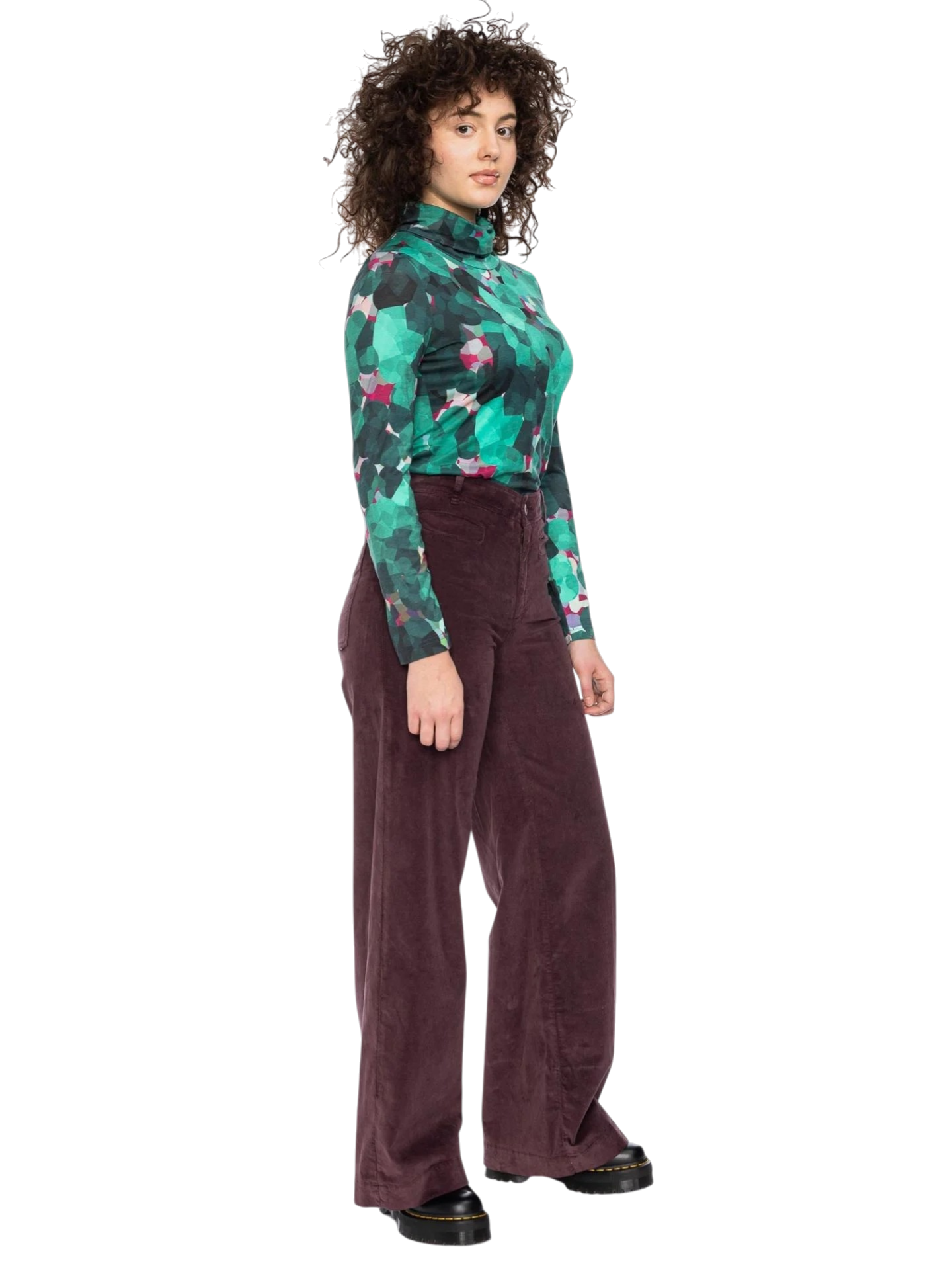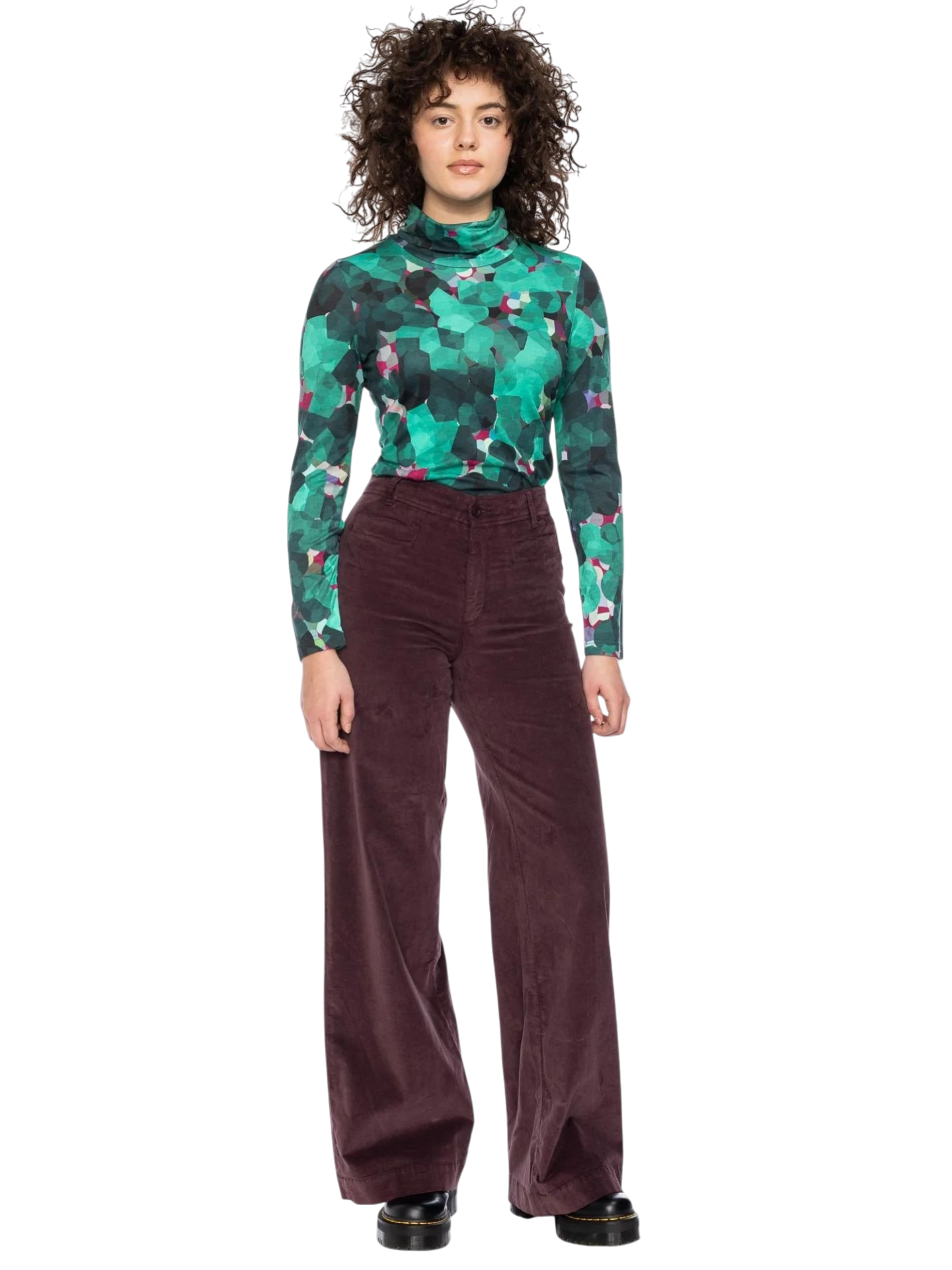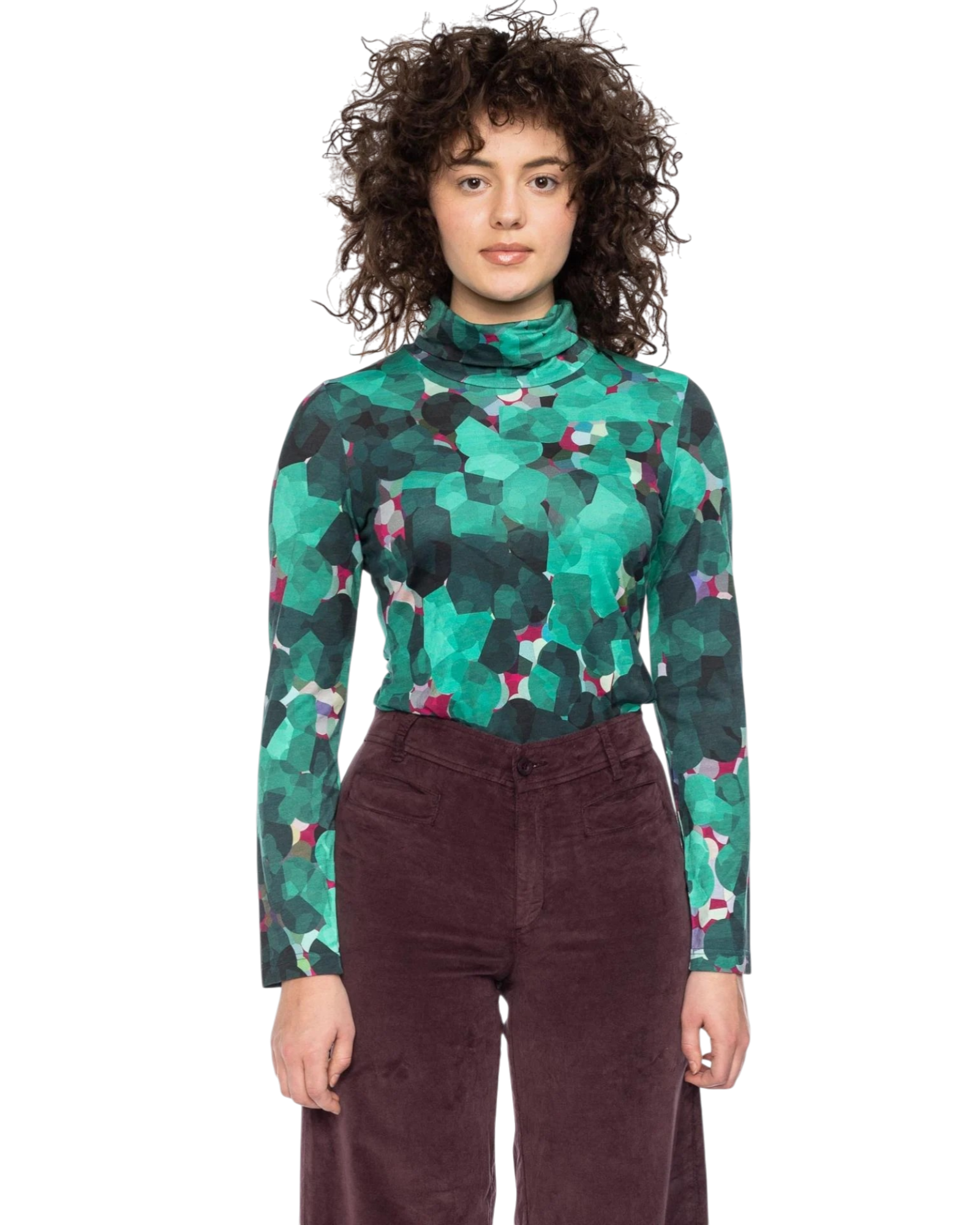De Rolli top van Ato Berlin is een stijlvolle coltop met een speels grafisch patroon in groen, turquoise en roze. De hoge col voelt zacht en warm aan en geeft de top een elegante uitstraling.