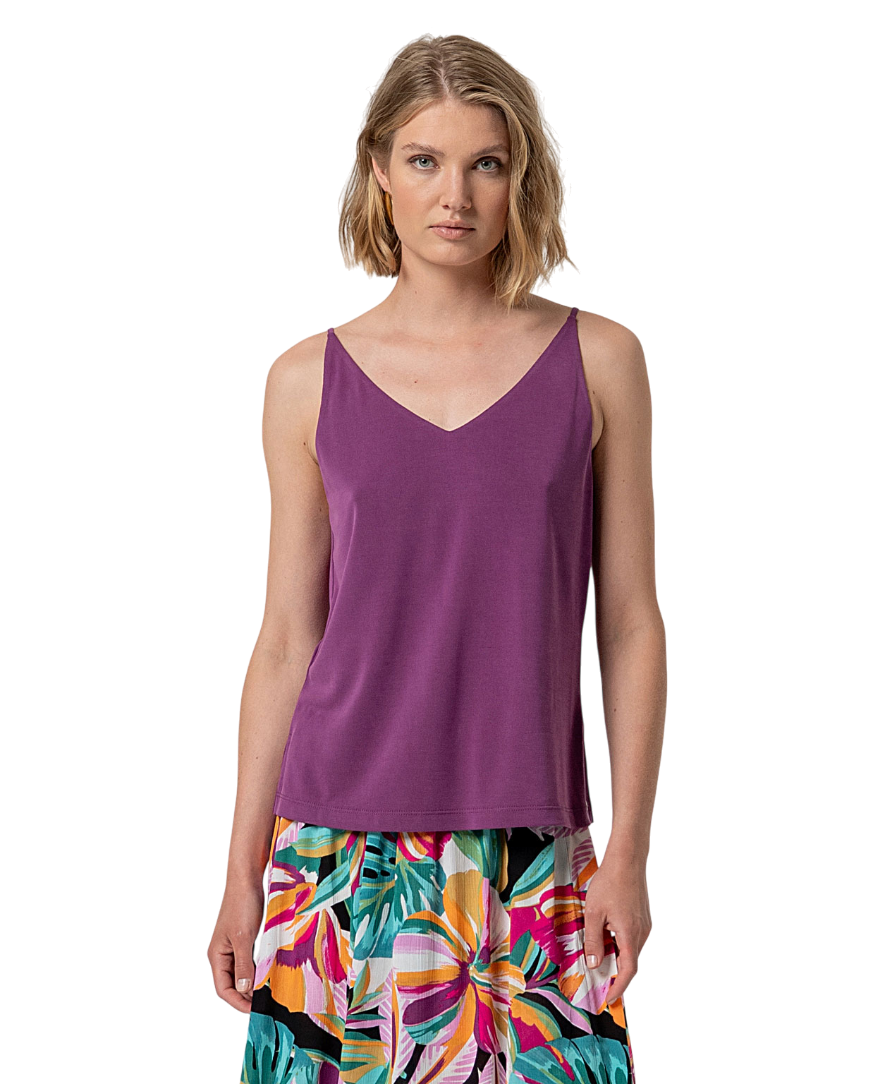 Luchtige top met smalle schouderbandjes en een vrouwelijke V-hals. De zachte modalmix voelt soepel aan op de huid en geeft dit item een comfortabele, elegante uitstraling.